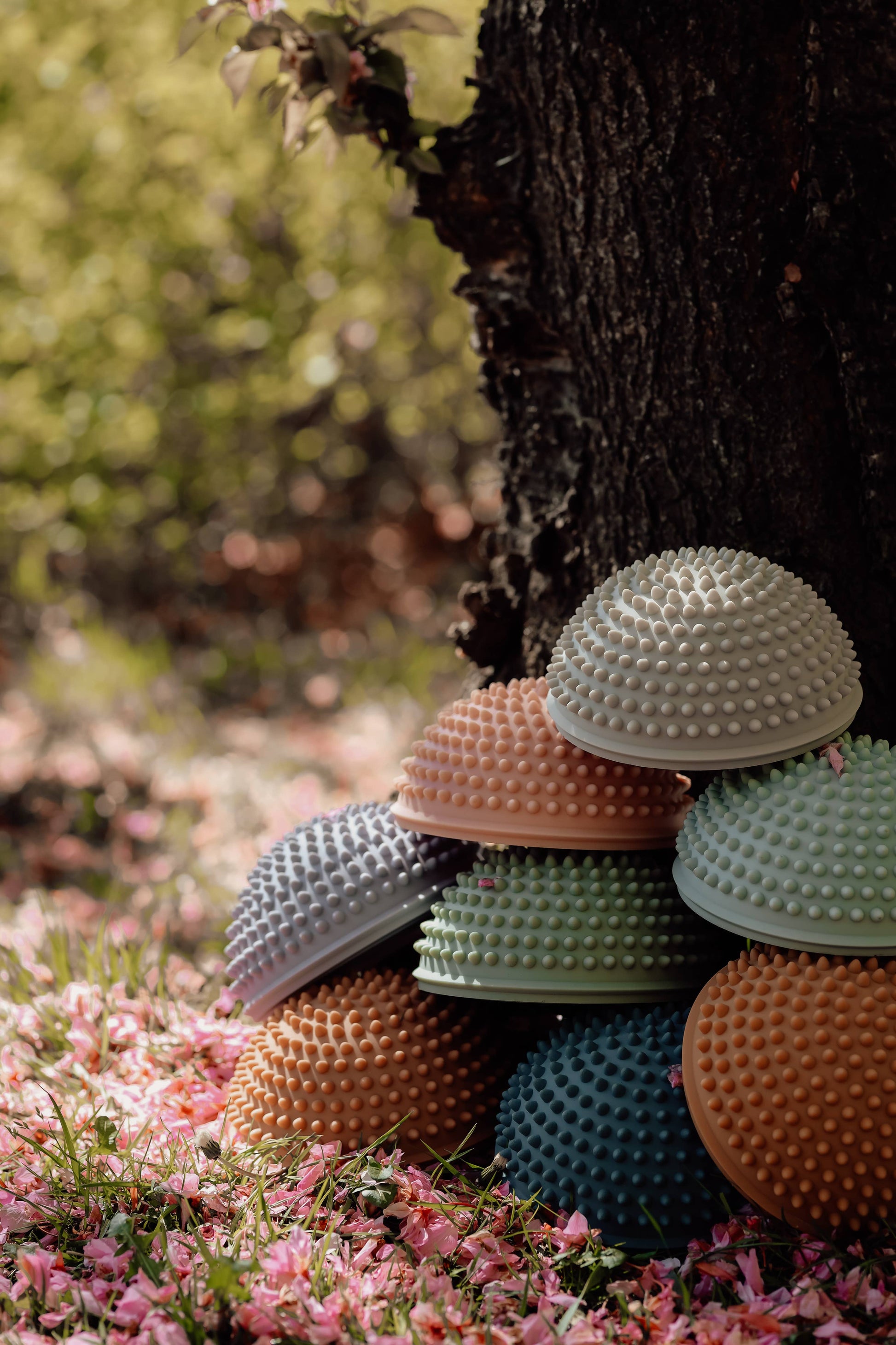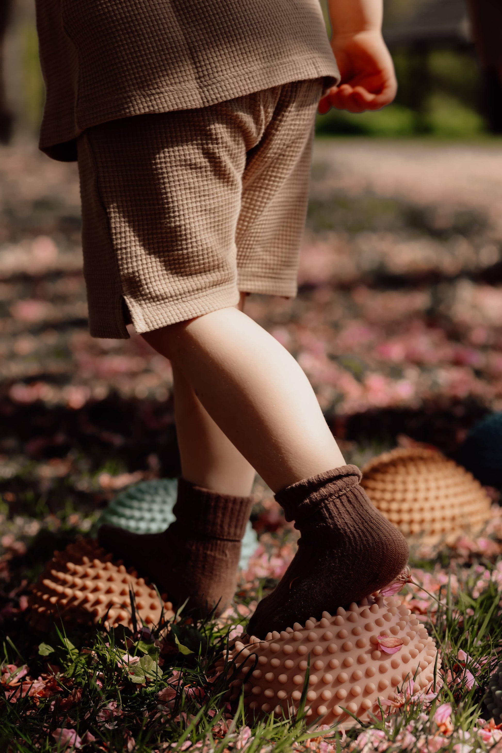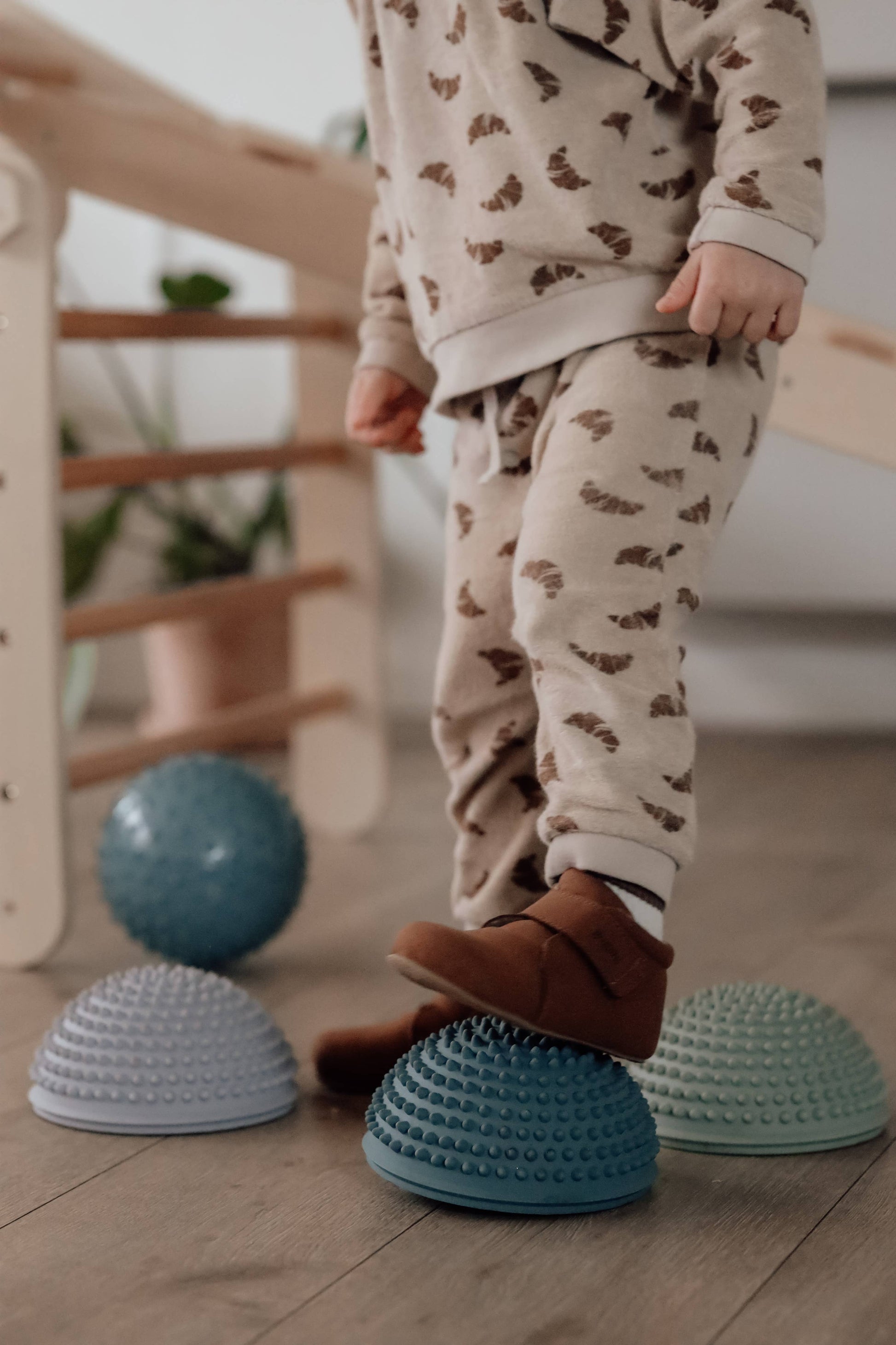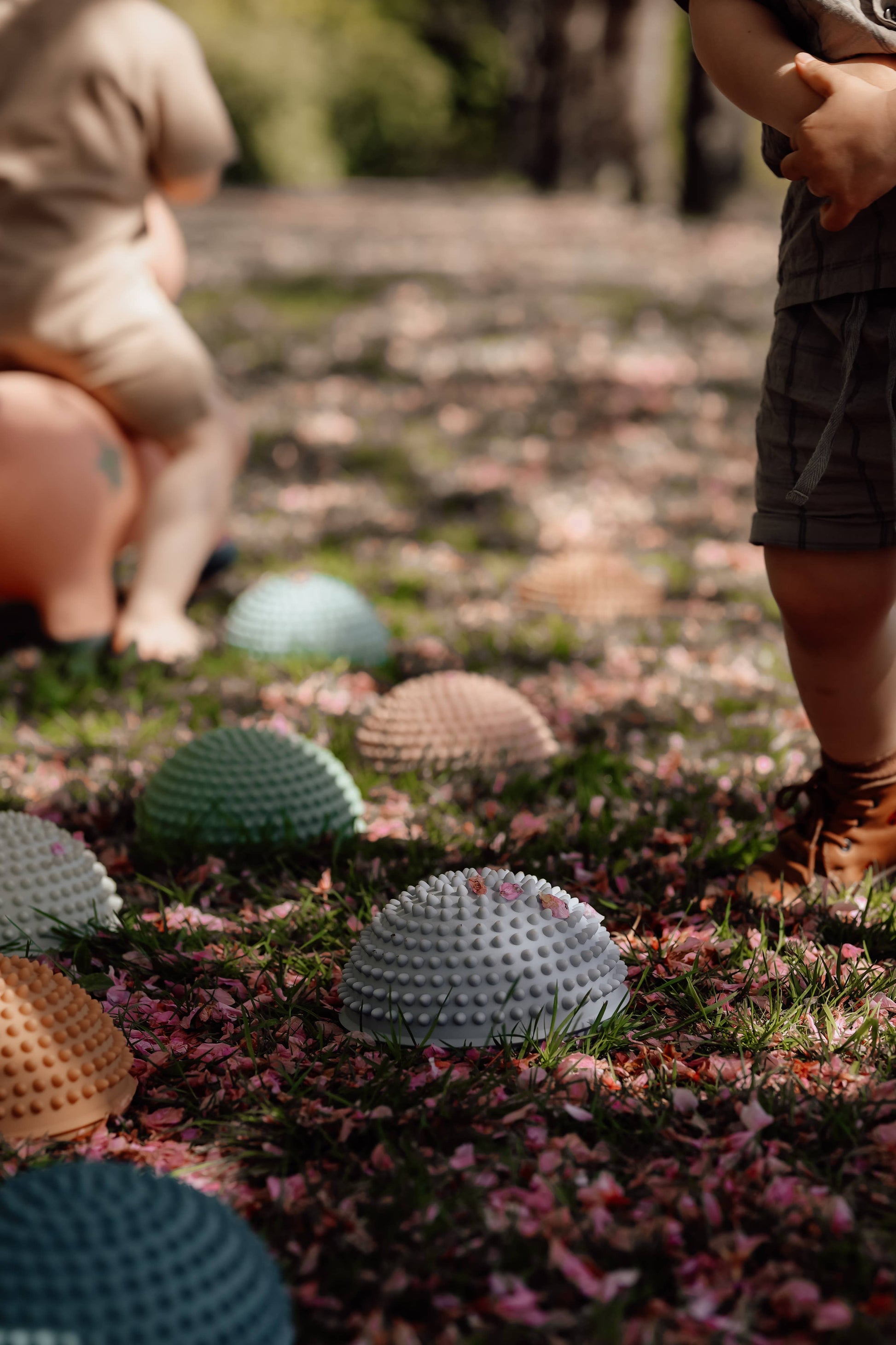 Dette sæt består af fire sanse-sten, som træner både balance og bevægelse. Stenene er flade i bunden og let buede på toppen. Hver sten har små knopper, der gør det lettere for barnet at stå sikkert, samtidig med at de stimulerer den taktile sans. De kan bruges på plane underlag både inde og ude, hvor de ligger stabilt.