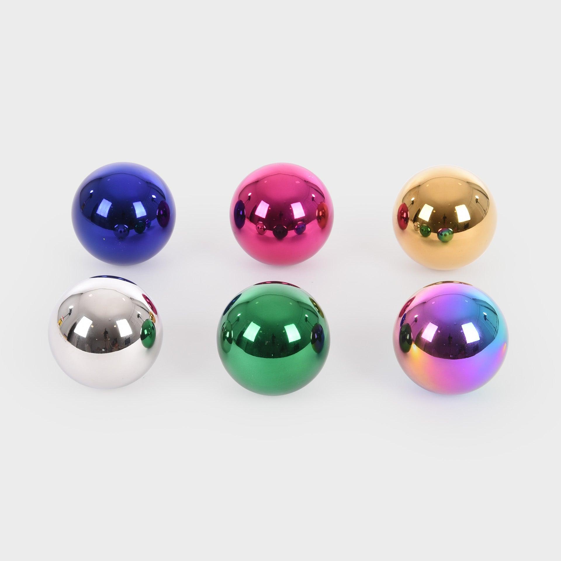 Farverne – blå, grøn, guld, pink, sølv og colorburst – fanger blikket, mens den spejlende overflade giver forvrængede, fiskeøje-lignende reflektioner, som børn finder både sjove og fascinerende. Kuglerne er lette, glatte og behagelige at holde i hånden, hvilket gør dem oplagte til sansestimulering, nysgerrig udforskning og tidlig leg.
