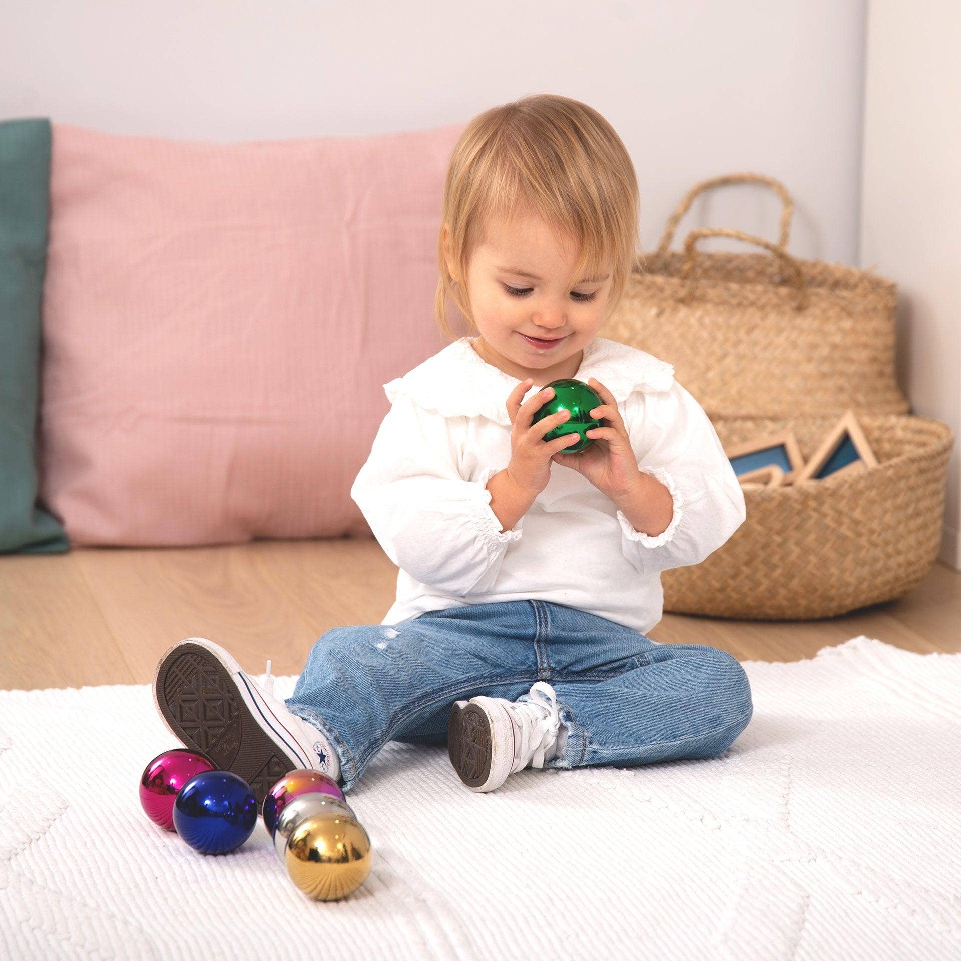 Et sæt med 6 reflekterende sansekugler i farverigt rustfrit stål, velegnet fra 0 måneder. Hver kugle har sin helt egen egenskab: nogle vugger, når de trilles, andre bevæger sig i uventede retninger, og flere indeholder elementer, der skaber forskellige lyde, vibrationer eller følesanser, når de rystes, spindes eller drejes.